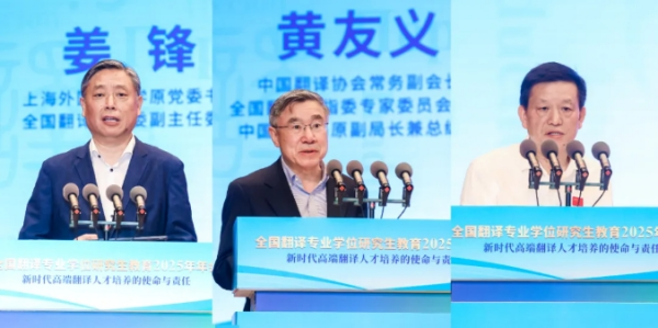 中國翻譯協會常務副會長、教指委專家委員會主任黃友義,上海外國語大學原黨委書記、教指委副主任委員姜鋒,湖南師范大學原黨委書記、教指委副主任委員蔣洪新作主旨發言。