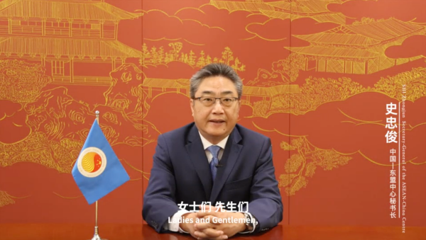 中國—東盟中心秘書長史忠俊、菲律賓駐華大使吉米、泰國駐華大使韓燦才發表視頻致辭。中國外文局副局長余應福,對外經濟貿易大學副校長、黨委副書記文君,國務院國資委新聞中心副主任張義豪出席開幕式并致辭。