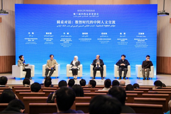 在圓桌對話環節,北京外國語大學阿拉伯學院副院長、教授尤梅,北京外國語大學教授、博士生導師薛慶國,約旦漢學家理事會成員、青年漢學家馬娜·阿卜杜拉-迪夫·卡瑪什,CGTN阿拉伯語國際頻道記者魯特菲(阿爾及利亞籍),北京外國語大學阿拉伯語學院教師任宏智,捷通華聲公司副總經理、總架構師陳明,國投投資企業APC CEO助理、董事會秘書助理艾瑞海等中外嘉賓,圍繞“數智時代的中阿人文交流”這一主題進行深入探討,分享了他們借助新技術、新平臺,開展中約、中阿人文交流工作的實踐成果與思考。